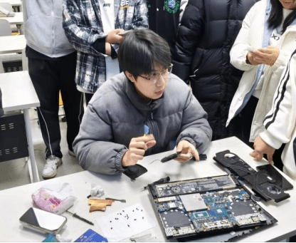 在实操环节,同学们分为两组进行实践操作。一组在冯佳辉同学的详细讲解下,学习了笔记本电脑内部清灰、检查更换散热硅脂等技术要点;另一组则在王星同学的现场指导下,实际动手操作,重点练习了排查排线接口、清洁接口部件等维护步骤。现场互动交流频繁,学习氛围专注而热烈。同学们通过这种“讲解+实操”方式,将理论转化为动手能力,初步掌握电脑硬件维护基本流程与方法。